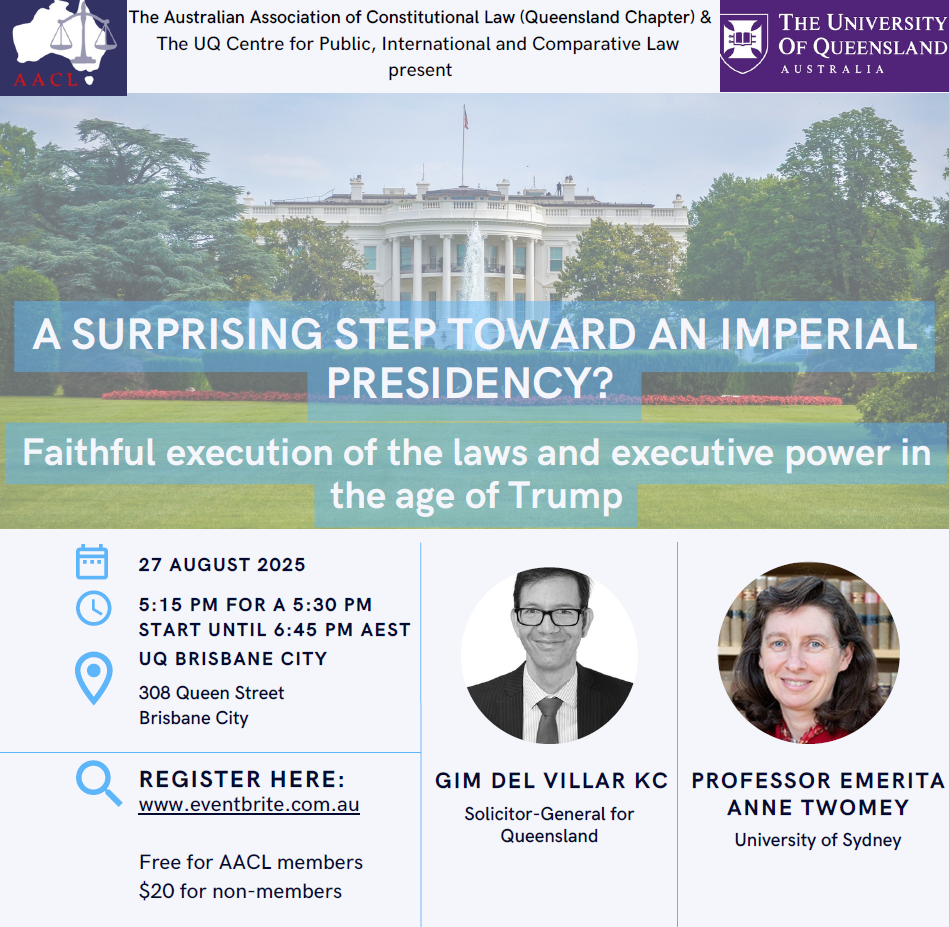 On 27 August 2025, the Queensland Chapter of the Australian Association of Constitutional Law (AACL), in partnership with the UQ Centre for Public, International and Comparative Law (CPICL), hosted a timely event titled “A Surprising Step Toward an Imperial Presidency? Faithful execution of the laws and executive power in the age of Trump.”
